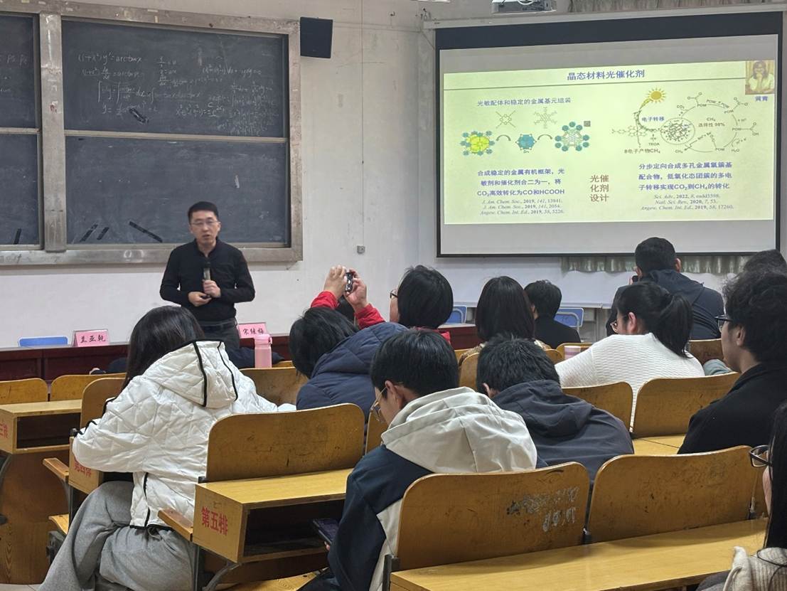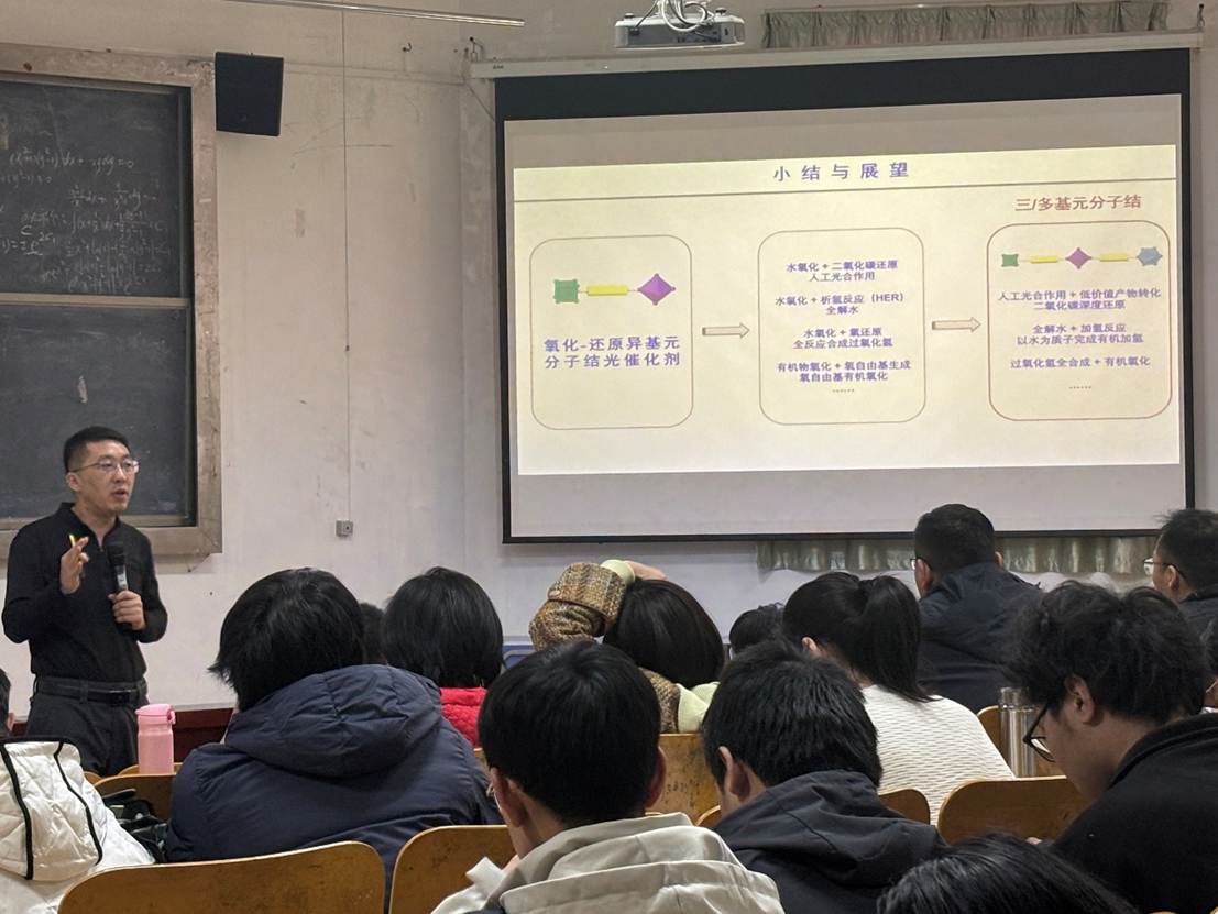 兰亚乾教授作为光催化领域的知名学者,长期致力于功能化晶态催化剂的设计合成及其光-电转化技术探索,在光/电催化小分子合成与转化研究领域成果丰硕。兰亚乾教授简要介绍了组内各晶态材料用于能源转换方面的工作,让在场师生对晶态材料在能源领域的应用有了初步认识。他详细讲解了异基元分子结光催化剂的创新概念、该类催化剂中氧化-还原分子结光催化剂的设计组装过程,并深入分析其独特优势。兰教授通过丰富的案例和详实的数据,阐述了异基元分子结光催化剂在多个重要领域的应用。最后,兰教授对三/多基元分子结催化剂的未来发展进行了展望,为科研人员的后续研究指明了方向。