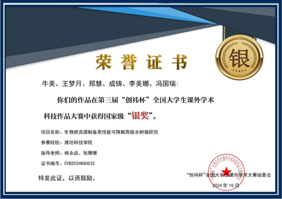 本次大赛旨在推动大学生参与课外学术科技活动,培养他们的创新精神和实践能力。来自哈尔滨工业大学、大连理工大学等高校的众多优秀学生团队齐聚一堂,展示他们在学术研究、科技创新方面的最新成果。经过层层选拔和严格评审,球友会学生团队作品《生物质资源制备高性能可降解高吸水树脂研究》,最终赢得了国家级银奖的荣誉。在比赛过程中,参赛同学不仅展示了扎实的学术功底和出色的创新能力,还展现了良好的团队协作精神和不畏挑战的勇气。