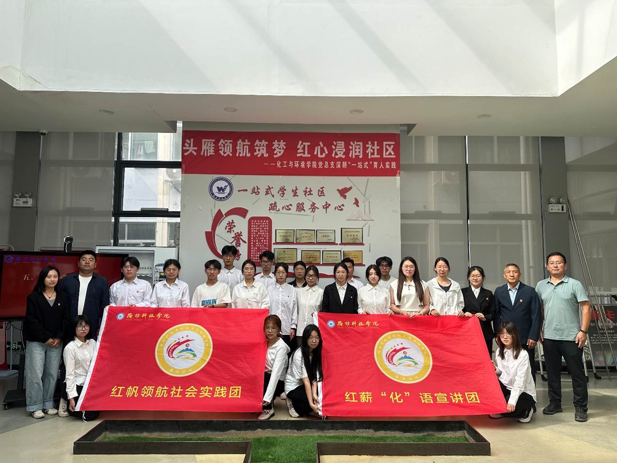 球友会党总支书记李法鹏为红薪“化”语宣讲团、红帆领航社会实践团授旗,号召学生以志愿服务为载体,传承红色精神。