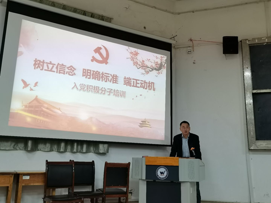 在全体成员奏唱国歌后,宋继梅表示非常欣慰能看到越来越多的年轻面孔积极向党组织靠拢,希望同学们一定端正入党动机和个人今后成长方向的轨道,要充分利用各种途径学习党史、马克思主义相关知识,要积极主动地向先进人物学习,从他们身上汲取自身发展的力量,还要在不断提升自我的同时带动身边人进步。董立斌宣读了《入党积极分子培训班学习和纪律要求》,介绍了此次培训方式、培训纪律、考核与结业要求。李建永为全体入党积极分子做了“树立信念,明确标准,端正动机”主题培训,他希望同学们牢记入党初心,在党课学习中了解中国共产党党员,坚定理想信念,加强品德修养,提高综合素质。