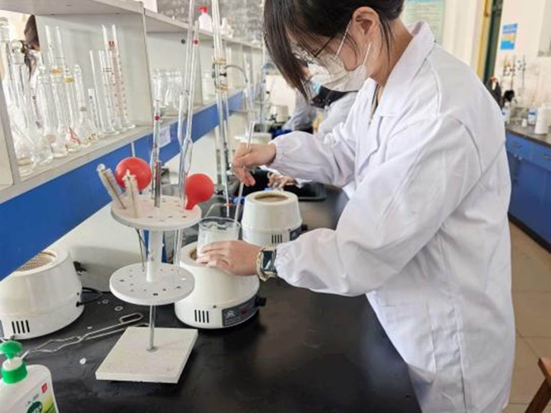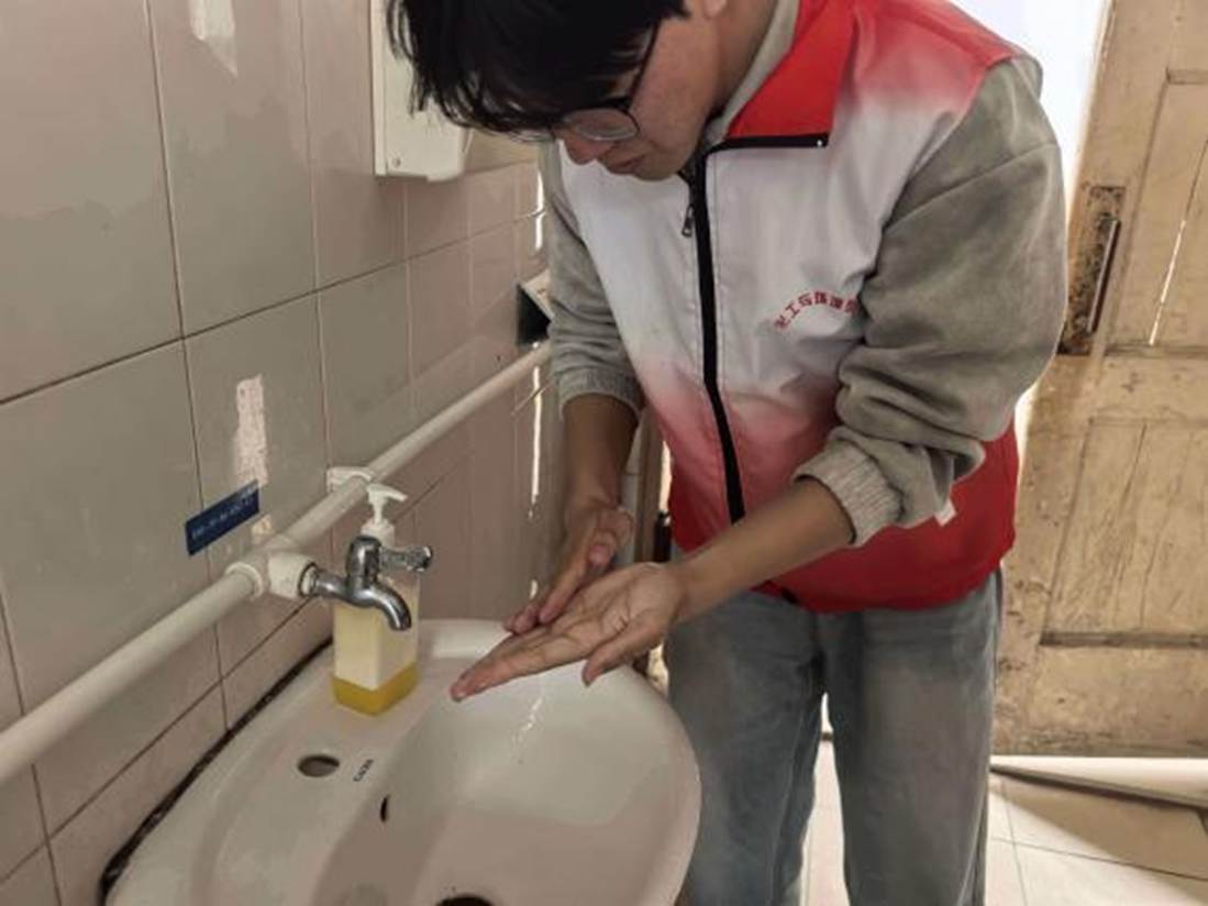 实验前,同学们掌握了洗化用品的制备原理和制备步骤。大家严格遵循实验规程,专注操作、细心调和,有序完成原料量取、混合搅拌、反应与静置成型等步骤,制备出安全实用的清洁防护用品。志愿者先行试用体验、认真核验品质,再将成品统一放至校园公共场所,方便师生取用。