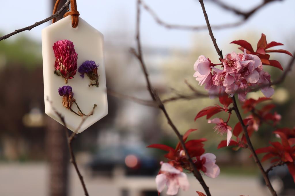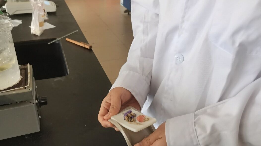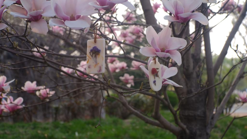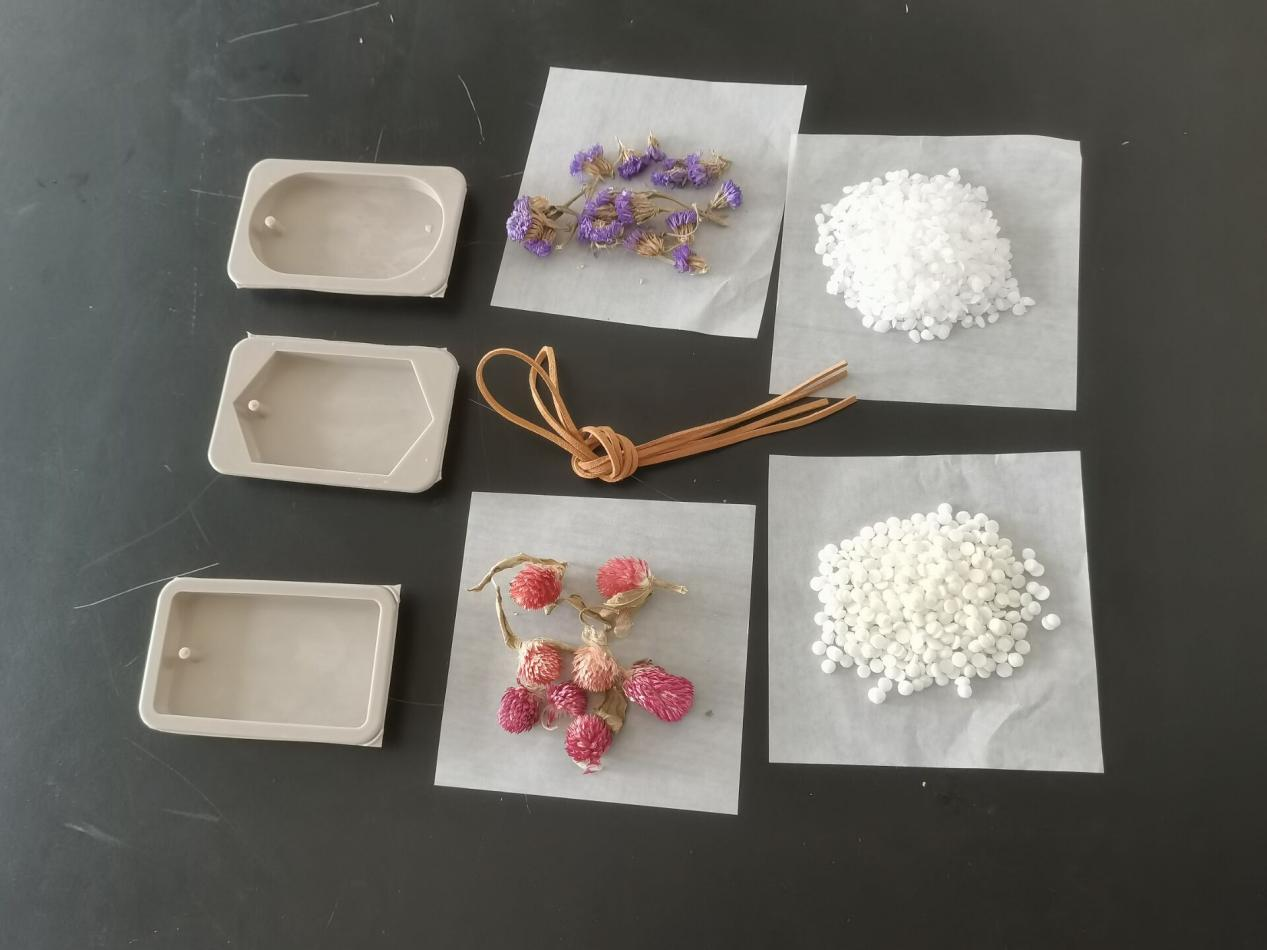 实验室里,同学们利用自己所学的专业知识,严格按照产品的制作工艺要求进行操作。先准备好晾晒干花、大豆蜡、白蜂蜡、植物香精、肥皂模具、仿皮挂绳等材料,将大豆蜡、白蜂蜡按照一定比例倒入小烧杯中进行水浴加热,再滴加植物香精,充分搅拌溶解。过程中可以依据个人喜好放入干花装饰,最后将得到的蜡倒入模具中进行完全冷却,取出蜡片并进行挂绳等装饰。同学们将制作的香薰蜡片悬挂在多姿多彩的校园里,为校园增添了一份别样的美丽。
