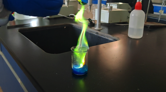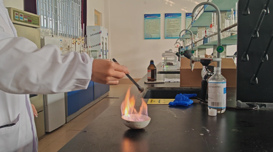 同学们首先熟悉了实验药品和设备,对各类金属盐样本进行分类认知学习。实验开始后,随着不同金属盐依次点燃,一场“光与美”的视觉盛宴绚烂展开:浓硫酸与硫酸铜经铝条置换反应后点燃,蓝色火焰幽然浮现;五水硫酸铜受热,绿色火焰跳跃闪烁;高锰酸钾和甘油混合点燃,橙色火焰中略带紫色光芒……实验结束后,同学们自行查阅焰色反应原理,深化专业知识的理解。